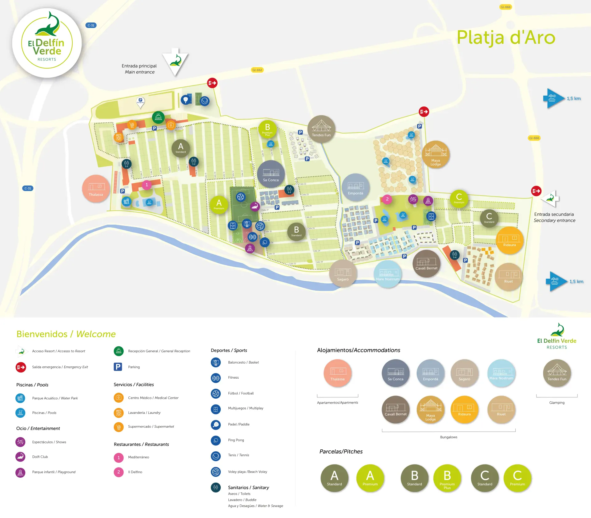 Located in Playa de Aro, one of the most exclusive towns on the Costa Brava (Spain) and close to the best beaches and coves, Camping Resort El Delfín Verde Playa de Aro is one of the largest campsite resorts on the Costa Brava, offering its guests more than 1,000 pitches and more than 200 rented accommodation units, all of which are of high quality and will make your family holiday an unforgettable experience.